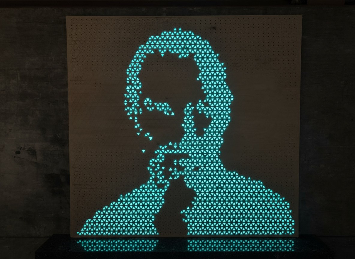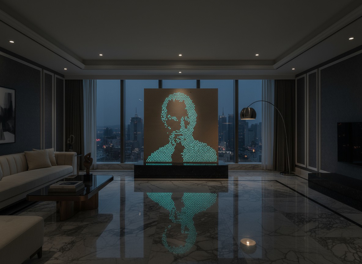 This isn’t just a portrait panel—it’s a tech-tribute that hacks tradition with a thousand geometric cuts. The icon emerges in sharp relief, every triangle a pixel punched through engineered wood, then spiked with glowing resin for that electric after-dark reveal. It’s legacy, coded in light.