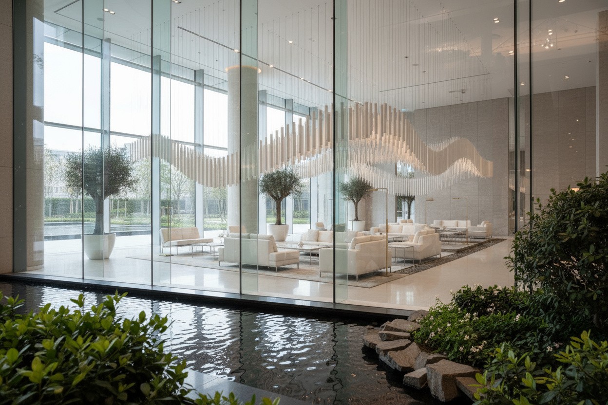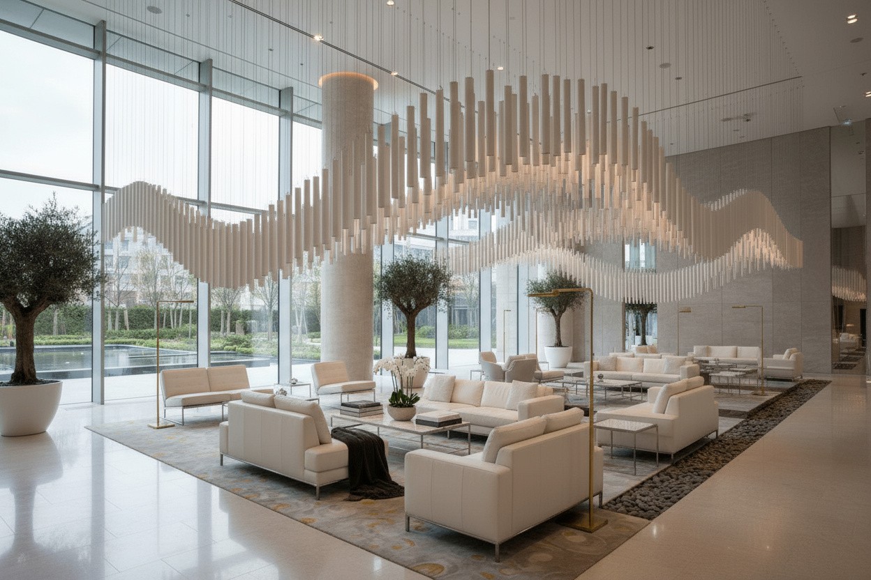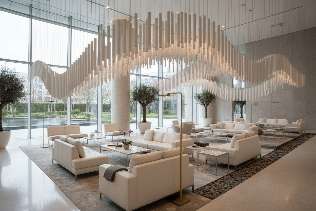 Nicknamed “wind chimes,” this parametric ceiling installation floats above like a frozen soundwave—each suspended element in perfect sync with the others, rippling across the space in a silent symphony. It blurs the line between architecture and motion, commanding the room while channeling pure, sculptural rhythm.